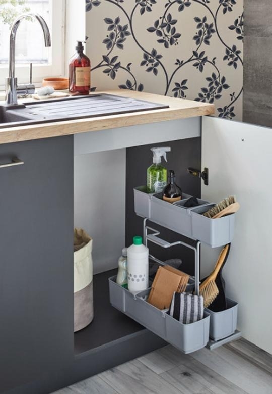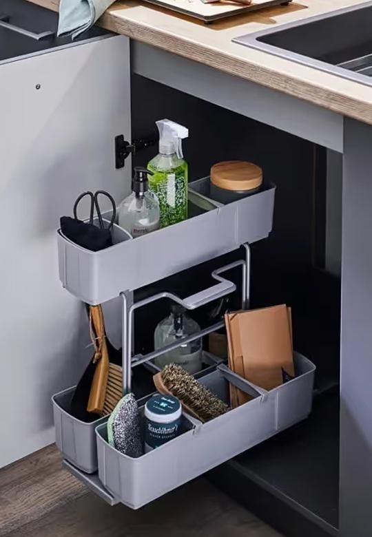 Це карго призначене для зберігання миючих засобів. Використання його в повсякденному житті полегшує роботу на кухні, його можна витягнути з кріплень направляючих та використовувати як переносний набір. Механізм має вбудовану систему м’якого закриття, що забезпечує комфорт при використанні.